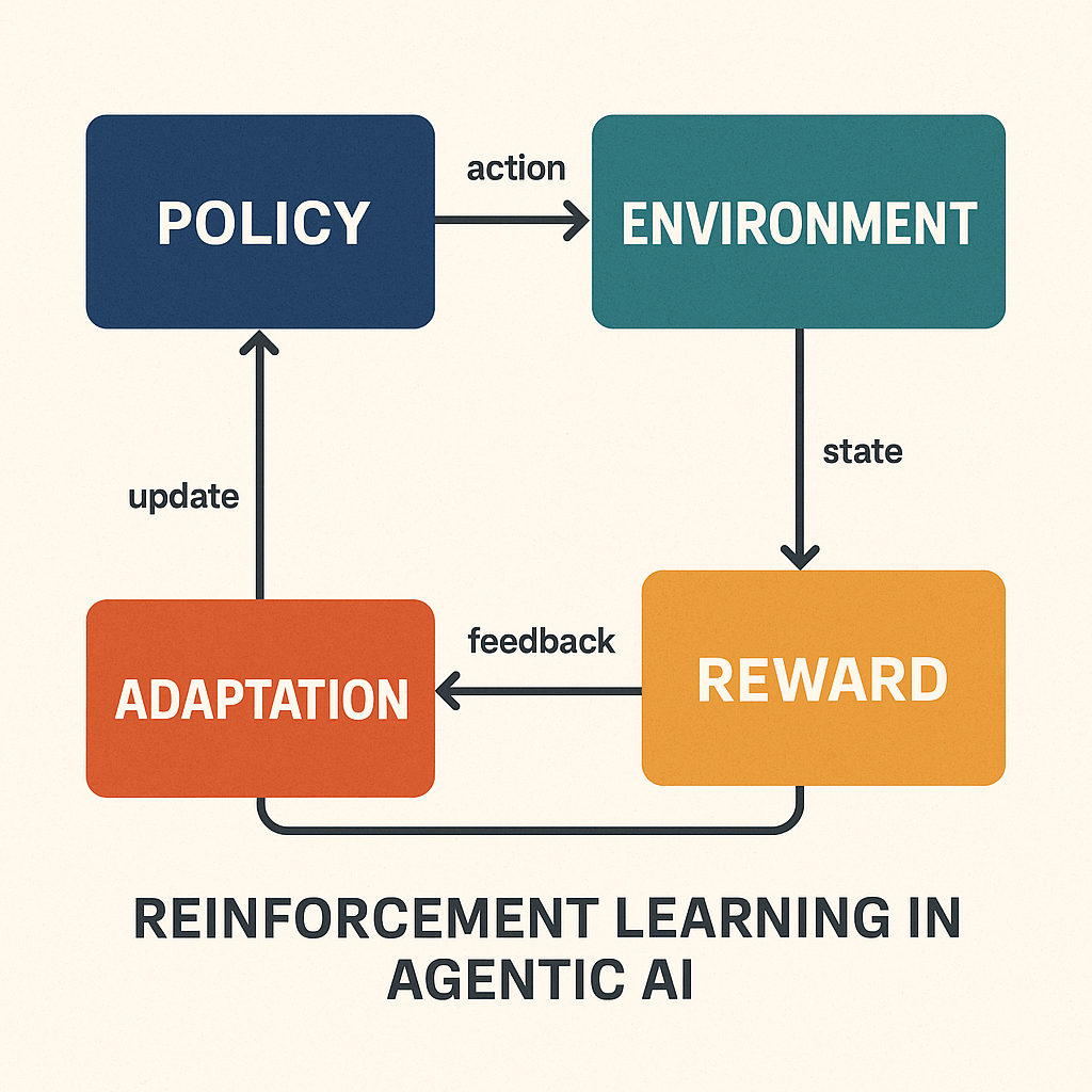 Reinforcement Learning (RL) is a core component of Agentic AI, enabling systems to make sequential decisions based on outcomes, adapt over time, and learn strategies that maximize cumulative rewards—not just single-step accuracy.